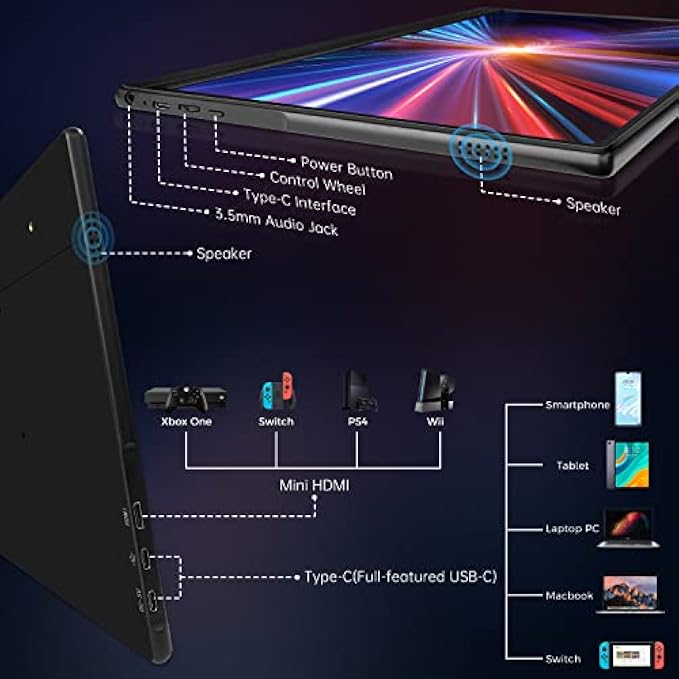 • 多功能數位連接 - 2 個 USB Type-C 連接埠和 Mini-HDMI 連接埠設計,讓這款可攜式遊戲顯示器更方便連接您的筆記型電腦、智慧型手機、個人電腦、PS3、PS4、XBOX ONE 或 Switch 等。 2 個內建喇叭有效顯示多媒體檔案,特別是在聆聽音樂/觀看電影/玩遊戲時。 左 usb-c 連接埠用於資料傳輸和電源供應,右側 C 連接埠僅適用於電源供應器。 配備 3.5 公釐音訊輸入,真正友善的設計。